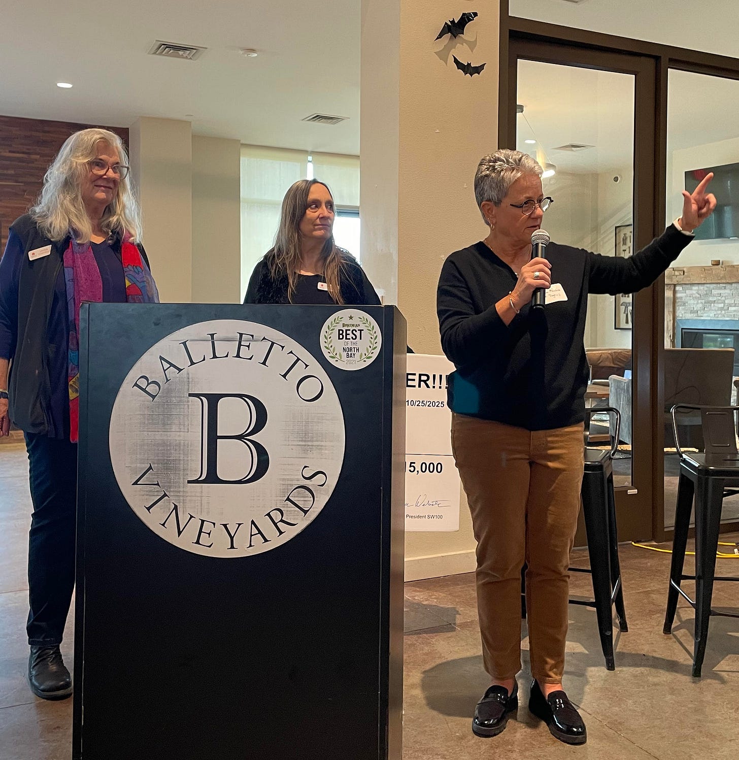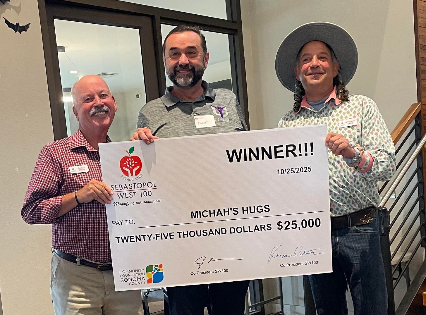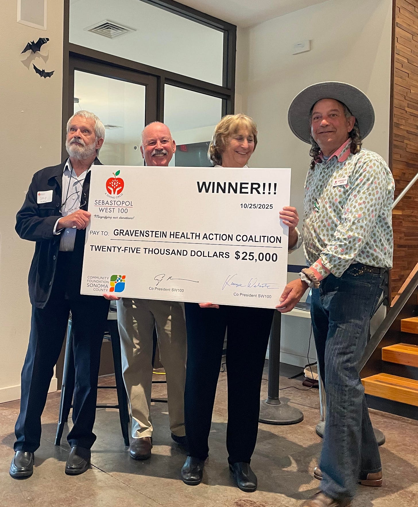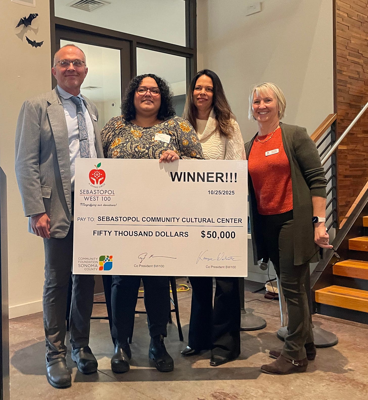 At a gathering yesterday morning at the Balletto Event Center, the Sebastopol West 100 (SW100) handed out giant cardboard checks, totaling $295,000, to eight nonprofits in west county. The winners were as follows: