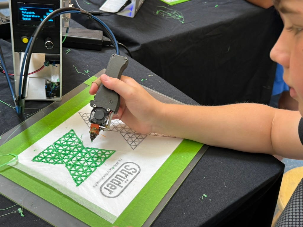 On the last day, Tim Keller of Inventopia in Davis, CA, brought several prototypes of a new product he’s developing, a 3D printing pen, called Struder. The kids got to try it out.