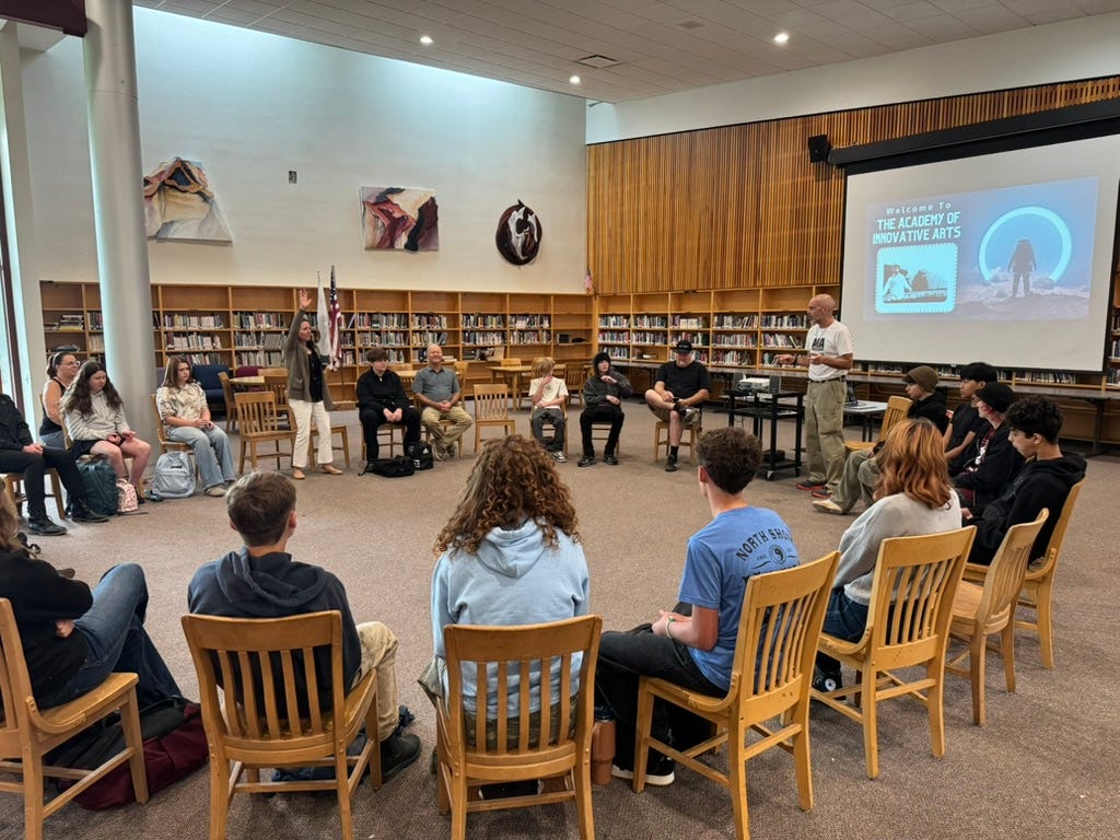 Teachers Cole Smith and Liqa Moin along with Principal Greg Alexander welcomed 21 students in the Library for the first day of the first class at the Academy of Innovative Arts. The school, which has been in the works for several years, was championed by Superintendent Chris Meredith and approved by the Board of Trustees last December. Cole Smith talked about the high level goals of the schools: Exploration, Community and Empowerment. The new school will be “student-driven” and focus on “growth over grades.”