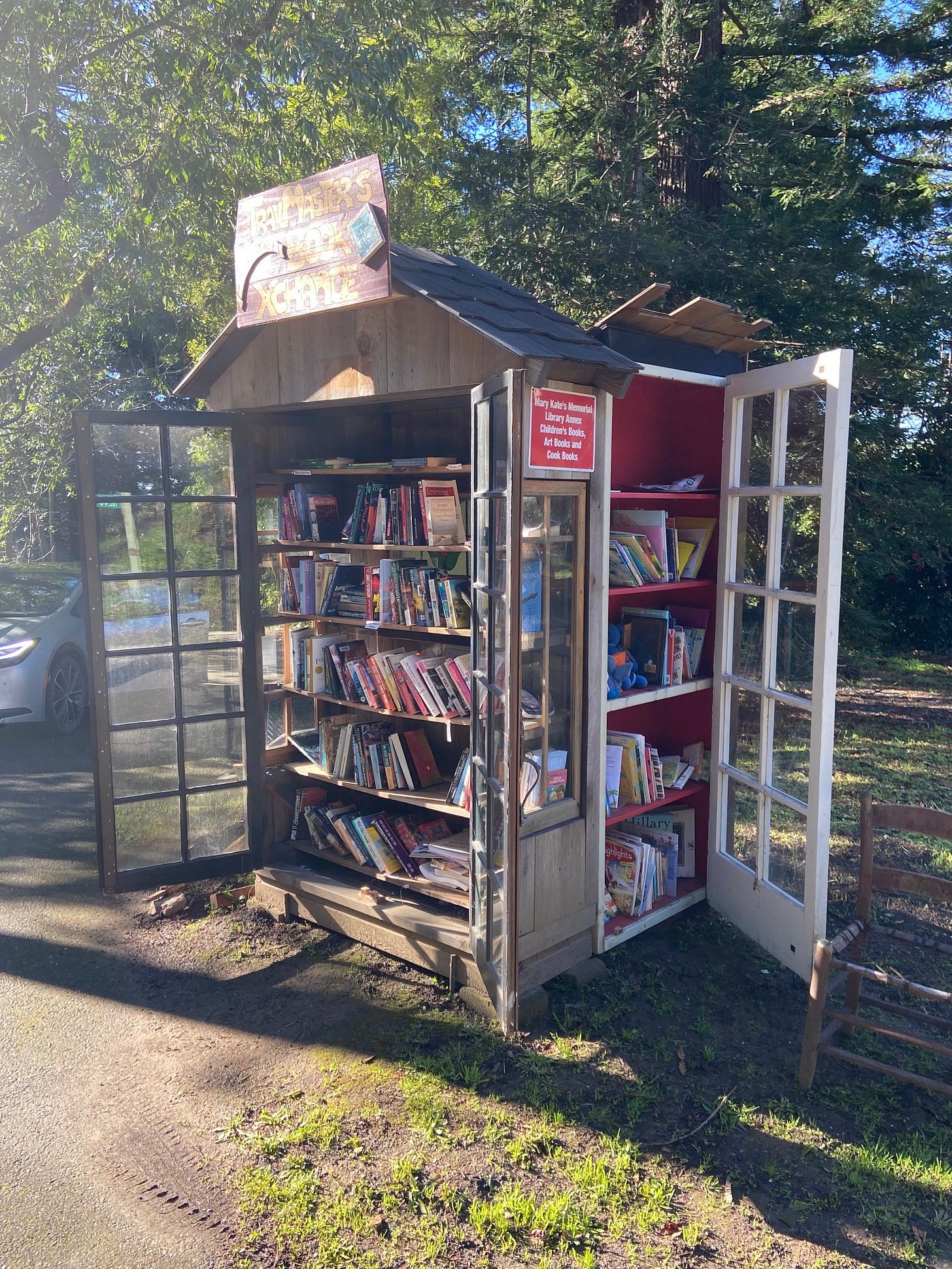 We live on a meandering paved path through the redwoods called Jonive Ridge (named after Jasper O’Farrell’s original land grant). I didn’t like how dark and dank the insides of the little libraries were so I wanted light—so my first book depository was made out of old windows I scrounged from neighbors.
