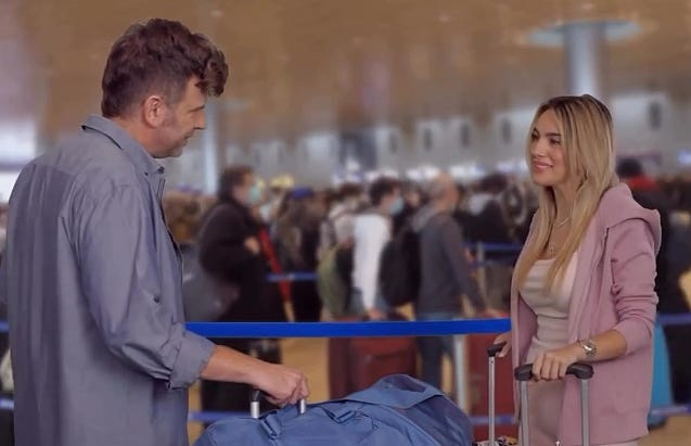 Two people pushing carts through the airport in Tel Aviv, bump into each other. They recognize each other as old friends.