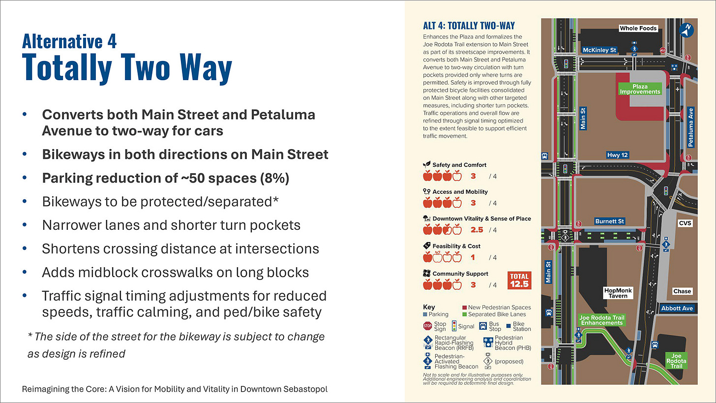 The actual motion that the council passed unanimously went as follows: “I move that we move forward with a Totally Two-Way system of vehicular circulation, using the kind of curb line and design of Alternative Three [Walkable One-Way], with bike facilities on a two-way cycle track on Petaluma Avenue, parking on both sides of Main Street, and improved pedestrian infrastructure.”