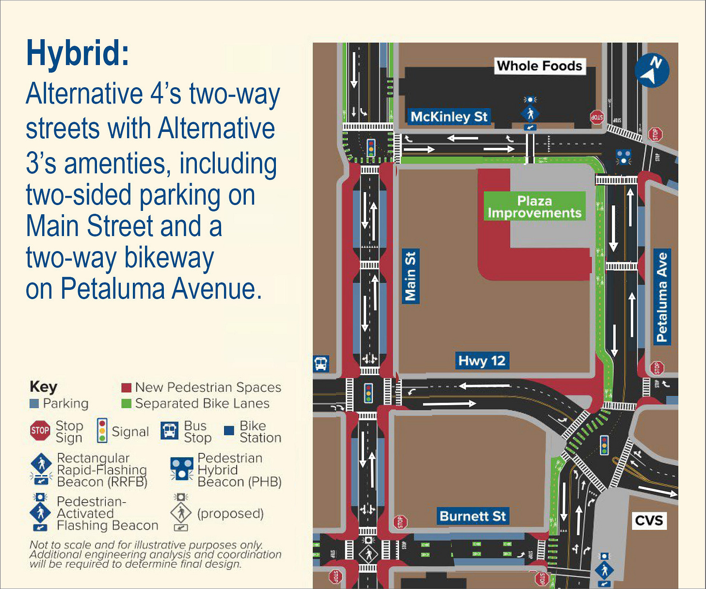 Then she and the other commission members began the process of imaginatively moving pieces of “Alternative 3: Walkable One-Way” into “Alternative 4: Totally Two Way.” They removed the two-way bike lanes from Main Street and stuck them on Petaluma Avenue. In the end, they came up with the hybrid plan pictured above. (“I’ve just seen how the sausage is made,” wrote one commenter, Kent Jenkins, on Part 1 of this article.)