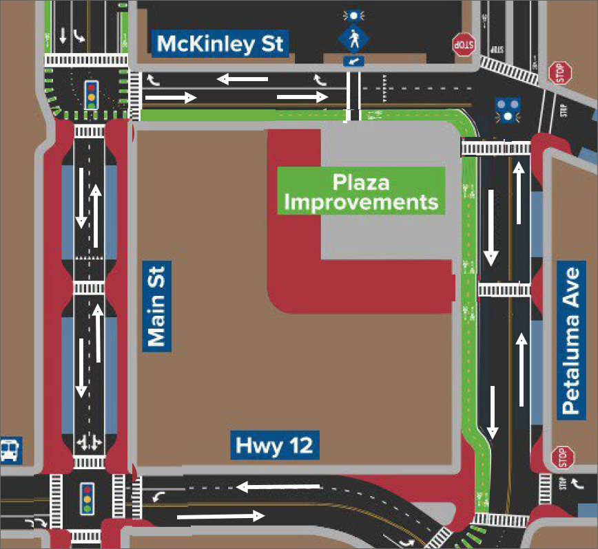 “In my mind, one of the biggest things with a totally two-way system—both streets [Main Street and Petaluma Avenue] being two way—is that we have a lot of flexibility about doing things downtown,” Fritz said. “We could close Main Street and have a festival. We could move the farmers market to Main Street. We could close McKinley and Petaluma Avenue around the plaza and have events on the plaza that spill into the streets.”