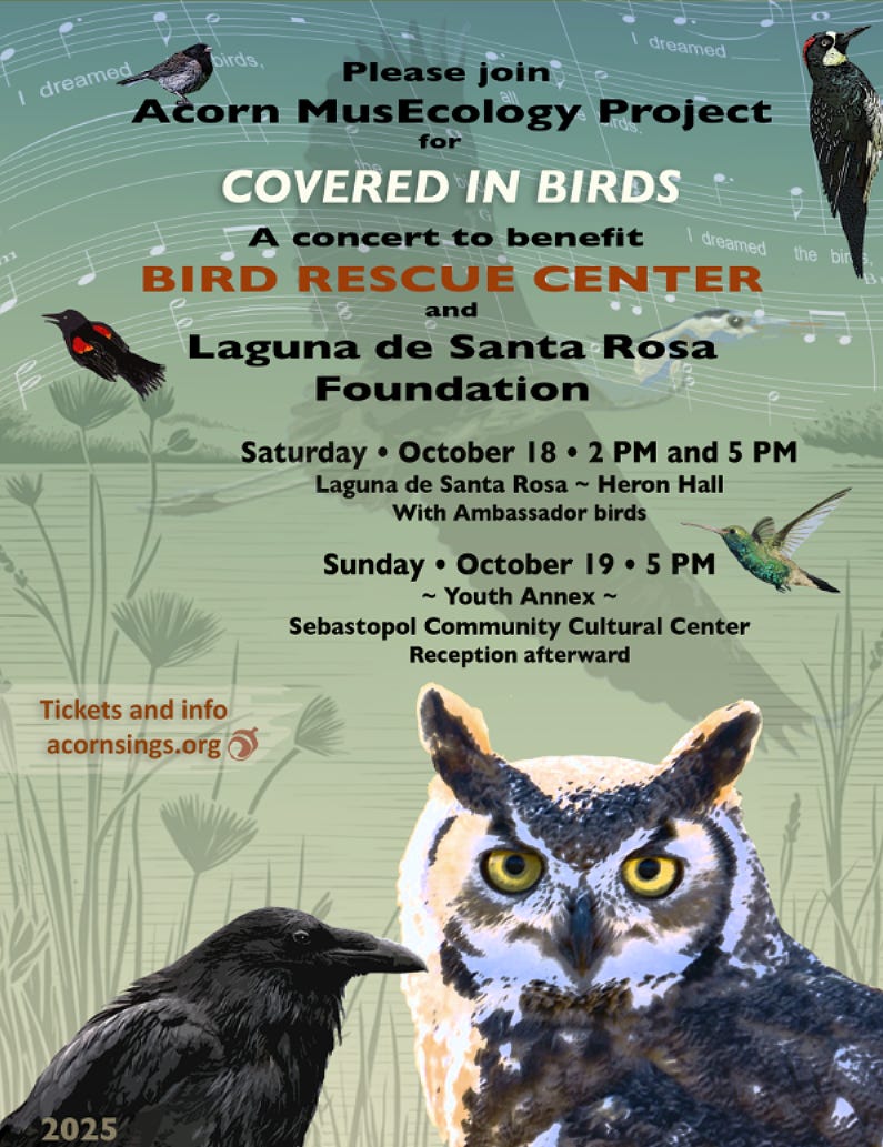 This weekend’s performances take place on Saturday, Oct. 18, at 2 pm and 5 pm, at The Laguna de Santa Rosa Foundation’s Heron Hall, where there will be opportunities to view “ambassador birds.” The performance on Sunday, Oct. 19, at 5 pm, will be at the Teen Annex of the Sebastopol Cultural Community Center. For additional information and tickets, see Acornsings.org. (Tickets can be purchased at the door as well, although for the Saturday 2 pm show, check the website first).