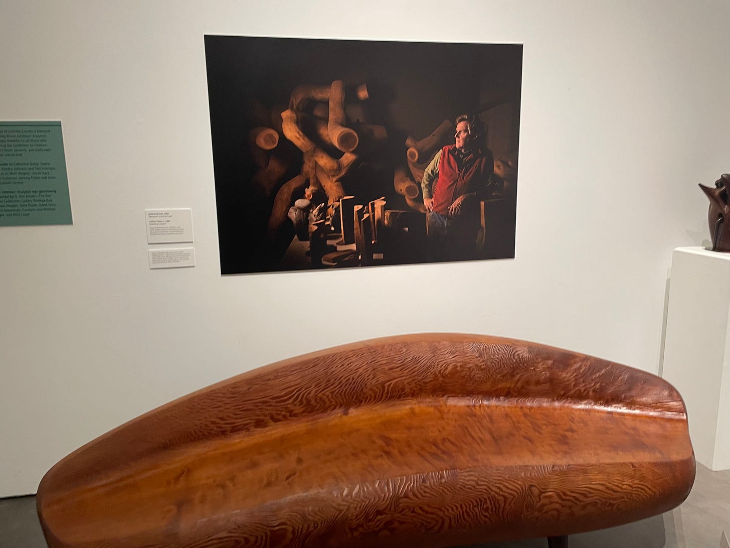 Johnson is known worldwide for his huge creations in wood and metal, especially redwood and copper. There is hardly any way to describe what he has done. For me, his large pieces are so strong, so full of intricate, if huge, segments, and so clearly fashioned with pulsing energy and care, that I just want to behold and take a deep breath in their presence. His smaller pieces have that same quality of being deeply cared for by the one who crafted them.