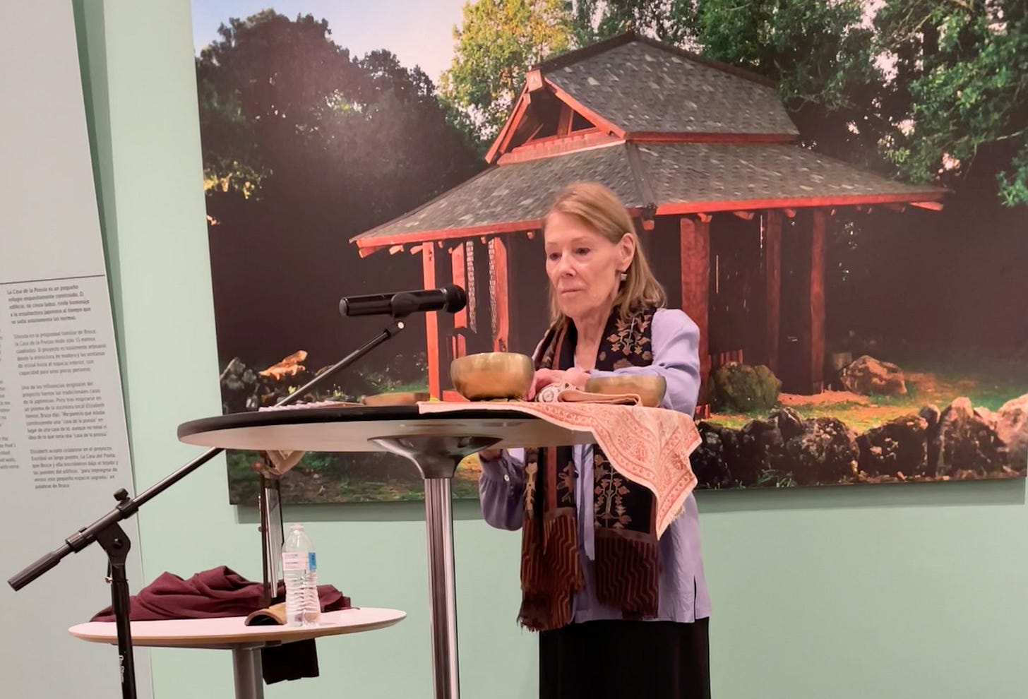 A small woman with pleasant ways and a warm smile, Herron wore a long black dress with a lavender wrap and a black stole embroidered with flower shapes. She stood at a table on which were three singing bowls, a row of small chimes, and a kind of wand. As she moved from section to section of her poem, various ringing accents came our way, as if to say “breathe now before we go on.”