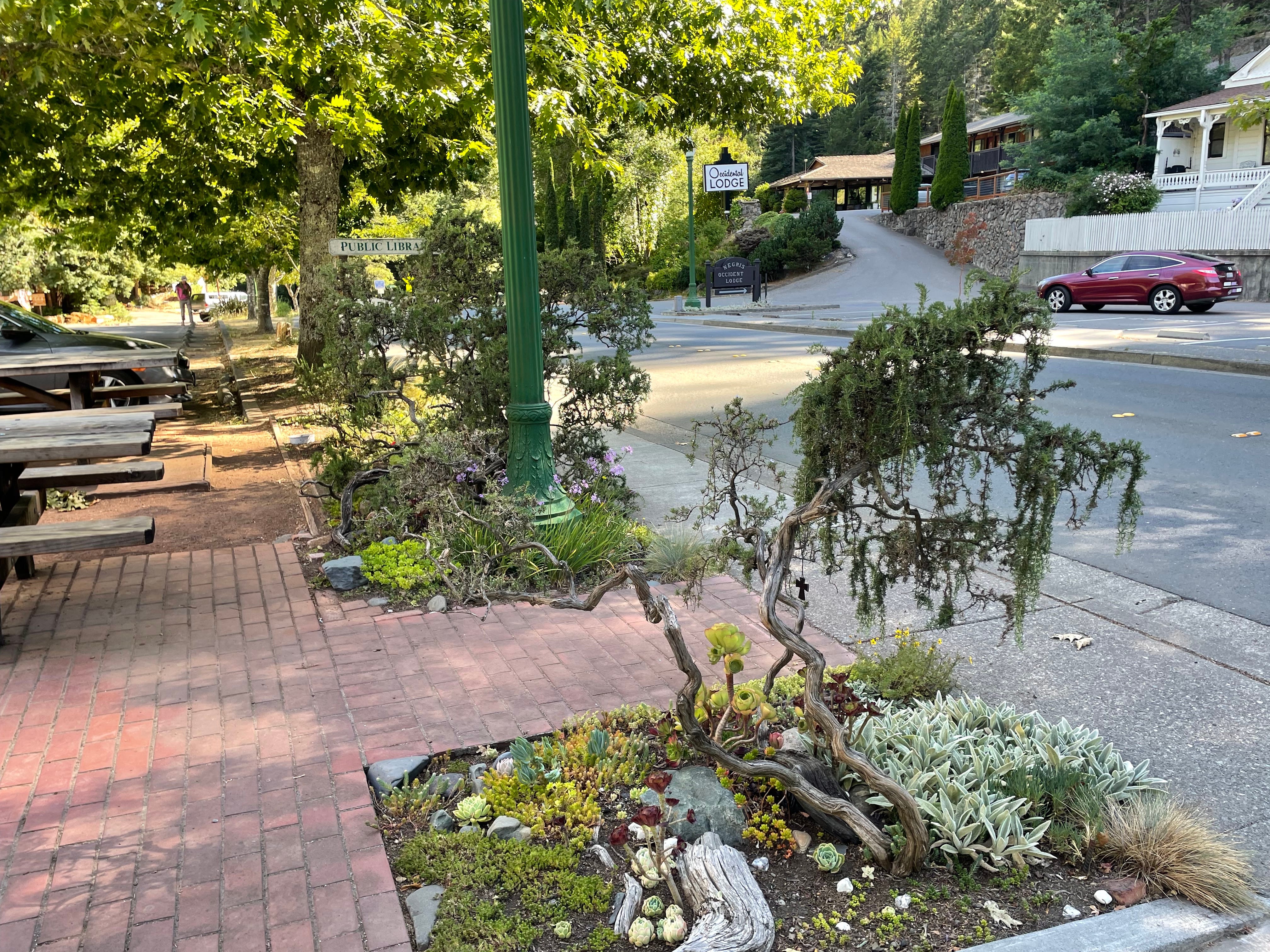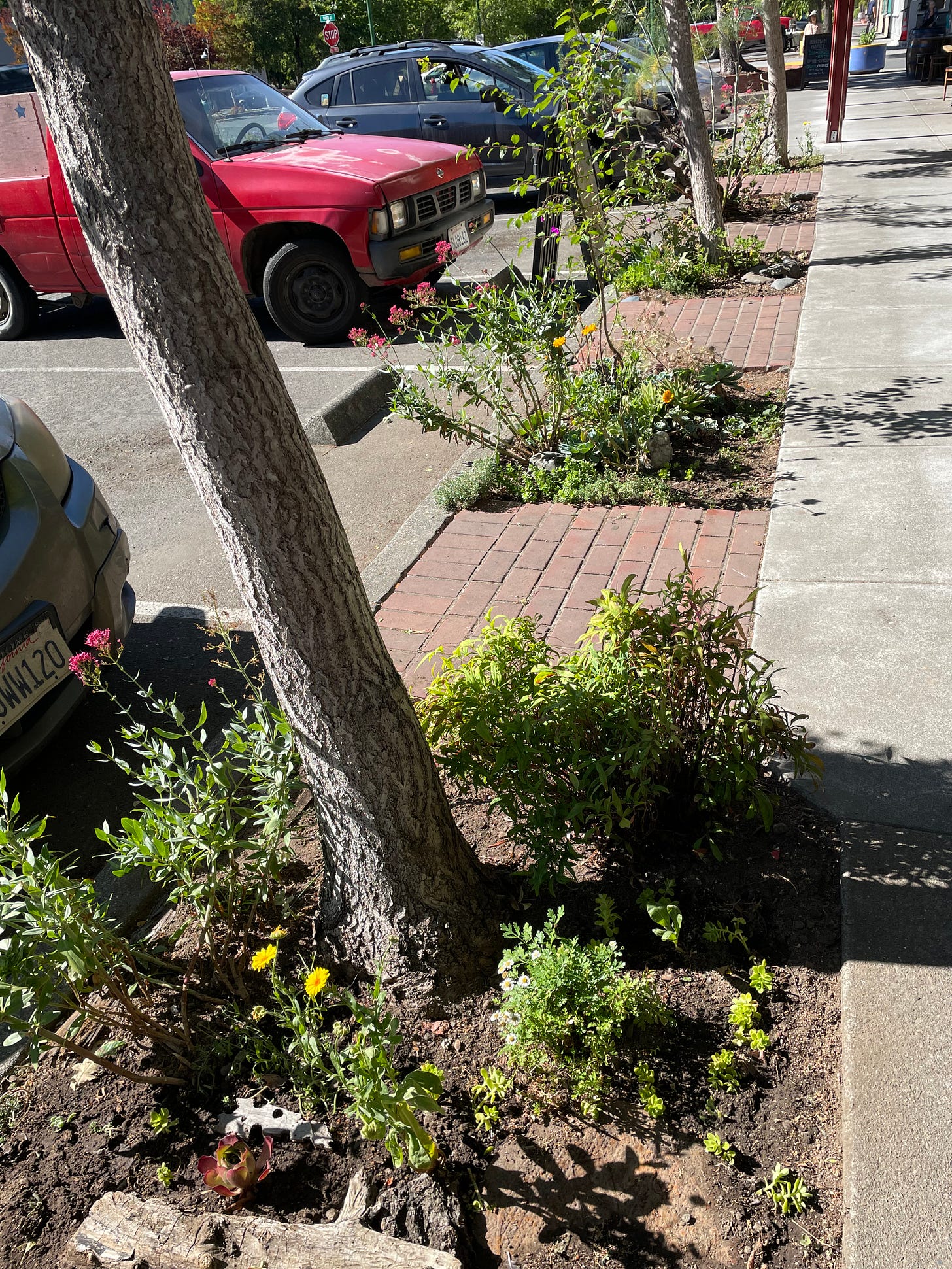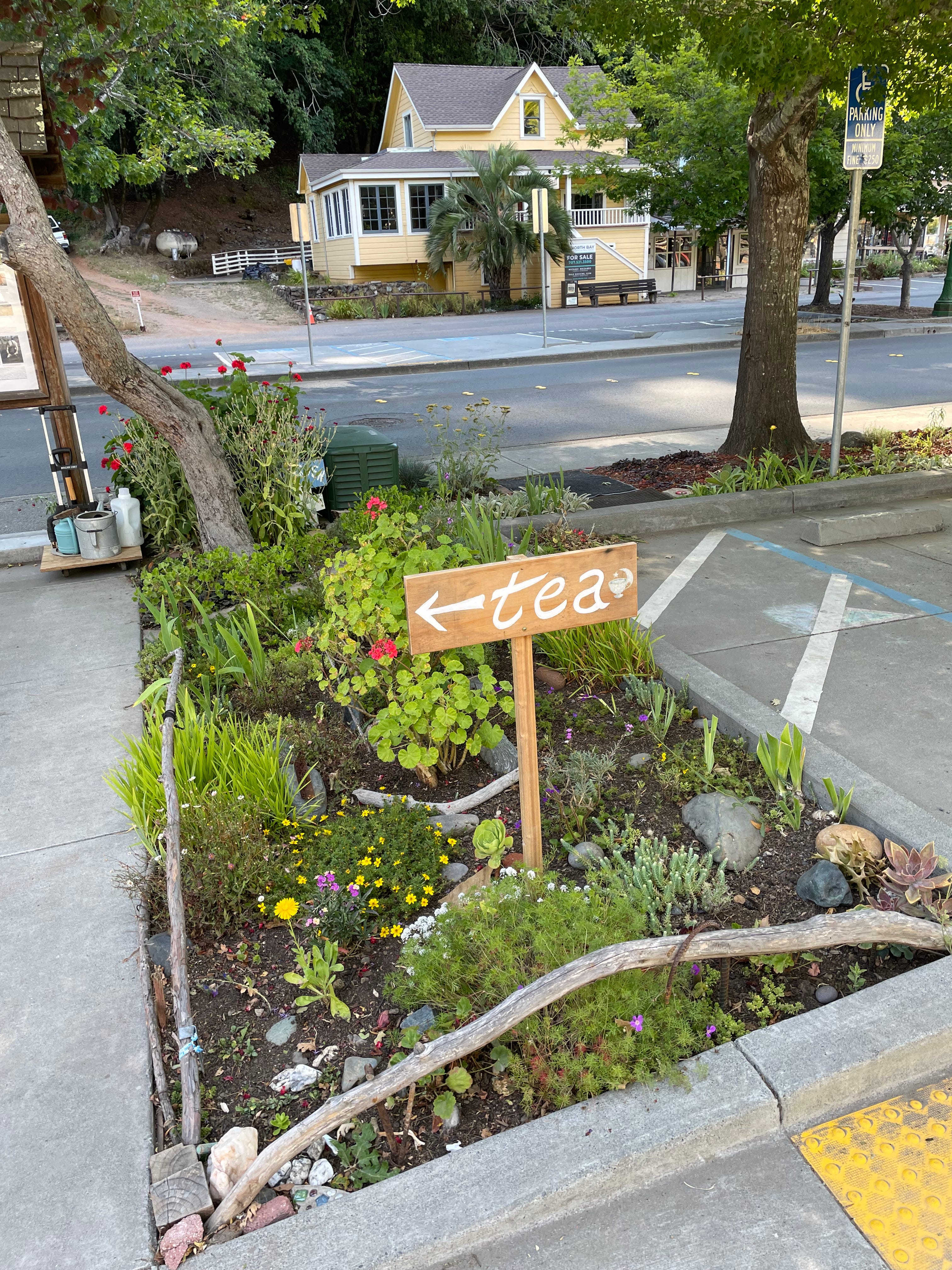 An elderly woman, who works as a house sitter and otherwise lives in her car in Occidental, is little by little transforming the town’s main street by creating small gardens in the dirt strip that runs along the sidewalk.
