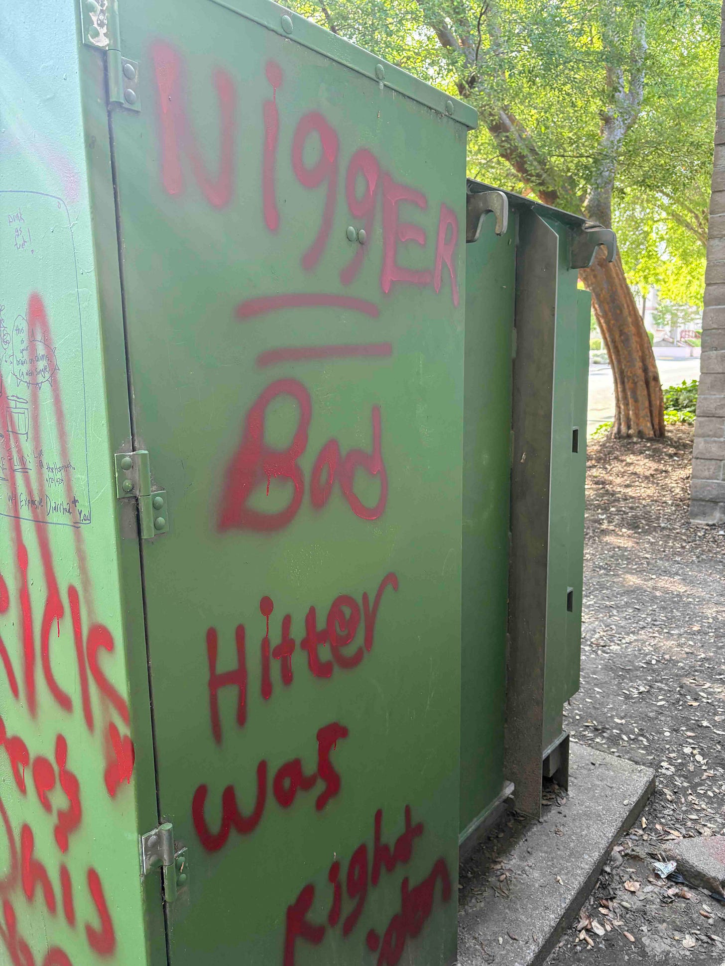 On Monday, April 27, Todd Swindell, a Sebastopol resident for 23 years, reported that someone had defaced a street-facing wall and a utility box on Pitt Avenue with Nazi symbols, the N-word, and the phrases “Nigga-killer” and “Hitler was right.”