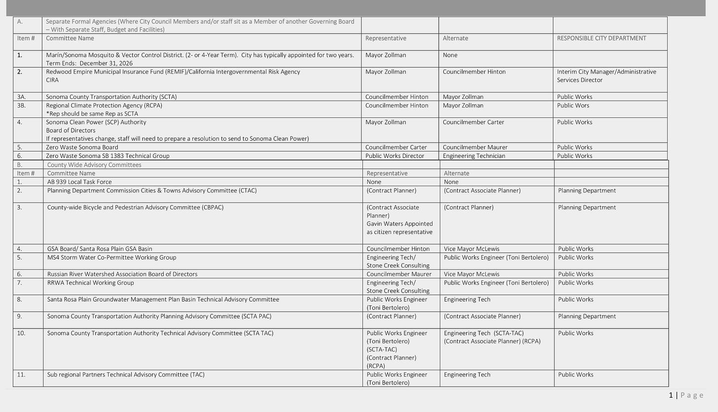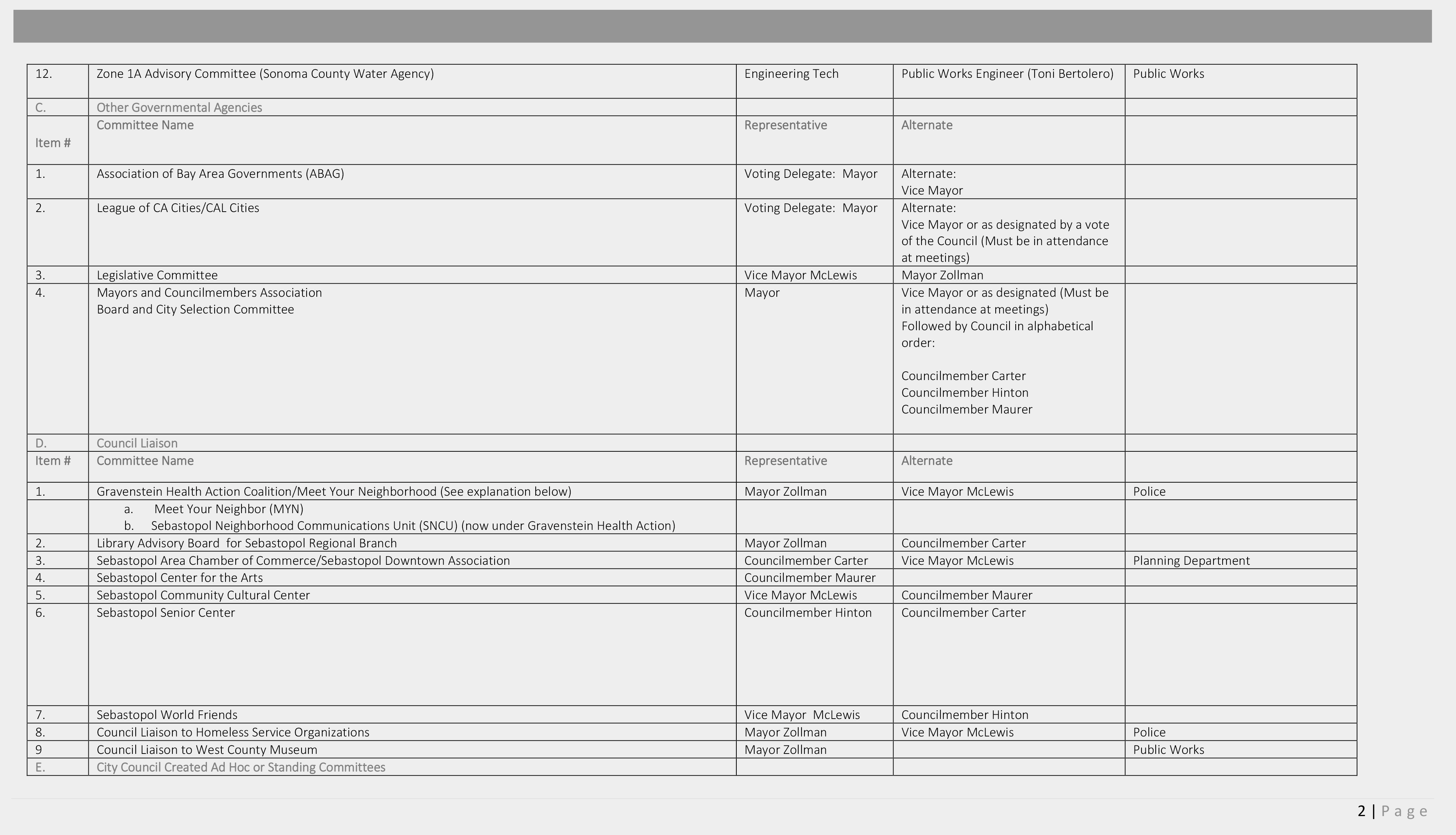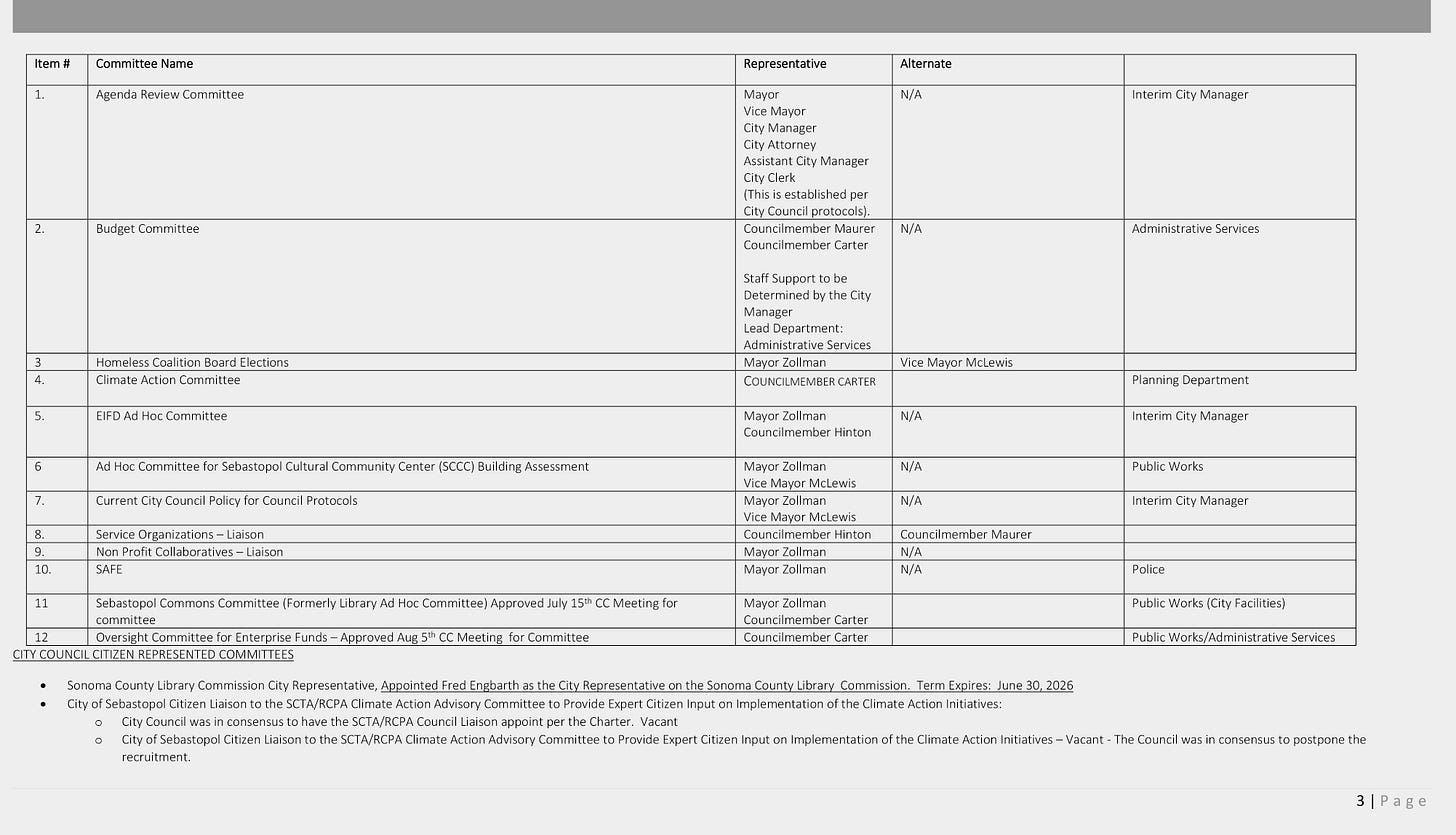 This list is a conglomeration of the Library Ad Hoc Committee and the Sebastopol Nonprofit Collaborative, which Mayor Zollman resuscitated last year. Councilmember Maurer asked why there were so many appointments from the library, and Mayor Zollman said, to paraphrase—that’s where the money is.
