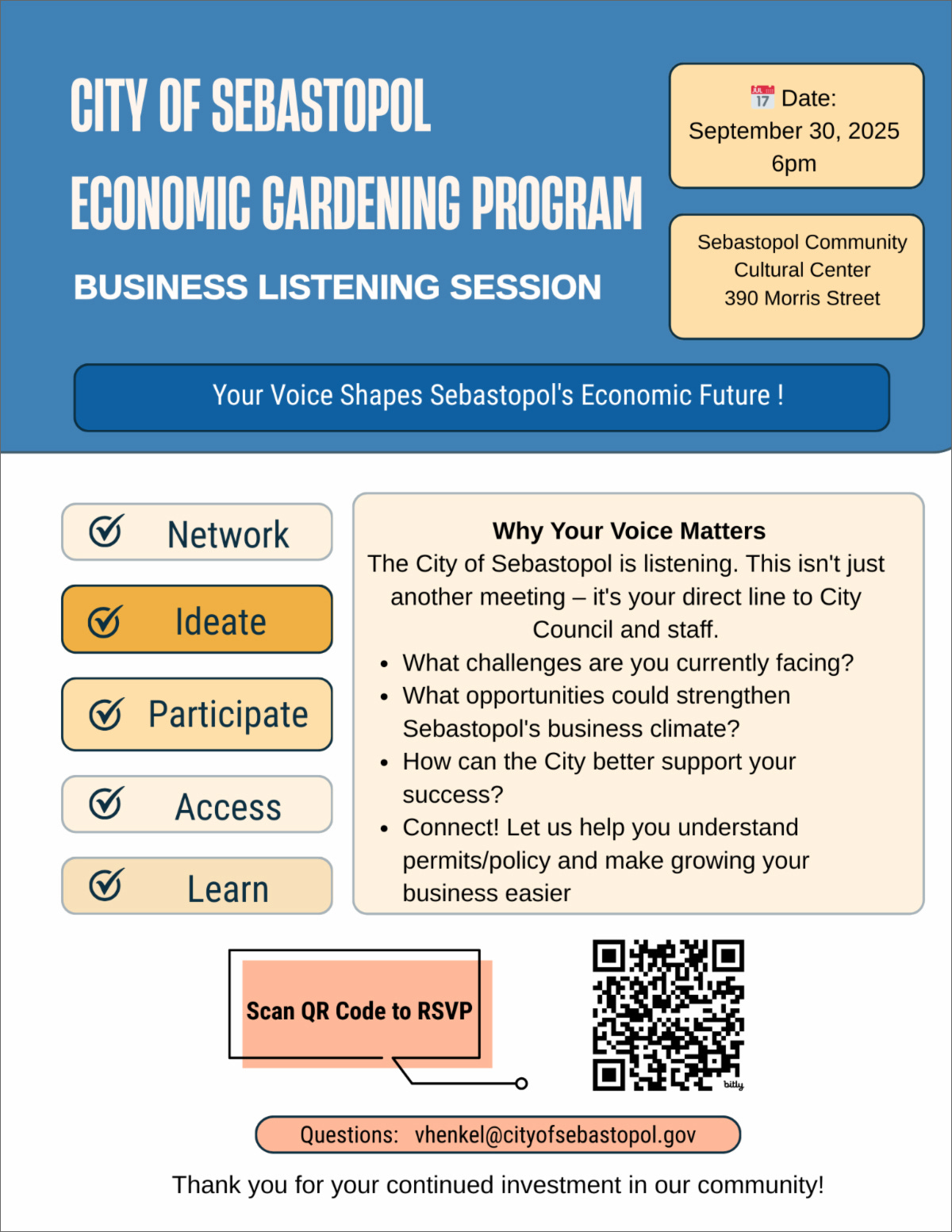 At their Sept. 2 meeting, the council decided on the date and structure for the first Economic Gardening event. It will be a townhall listening session scheduled for Sept. 30 at 6 pm at the Sebastopol Community Cultural Center, 390 Morris St. The council approved this idea 5-0.