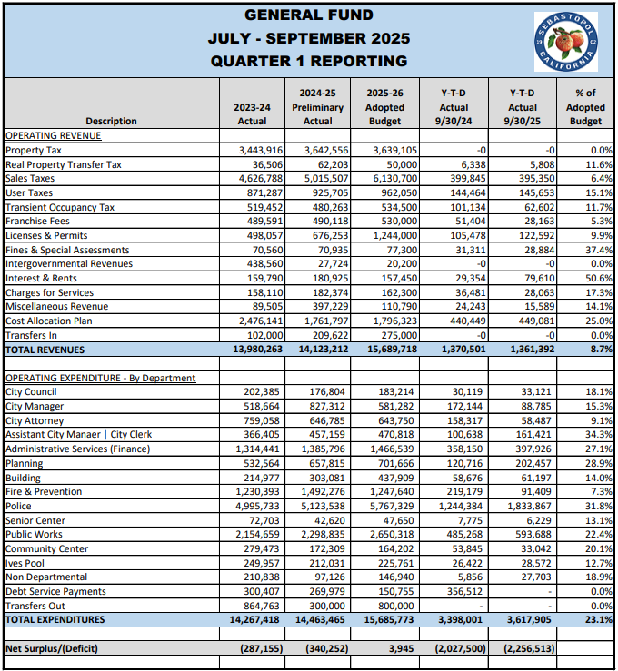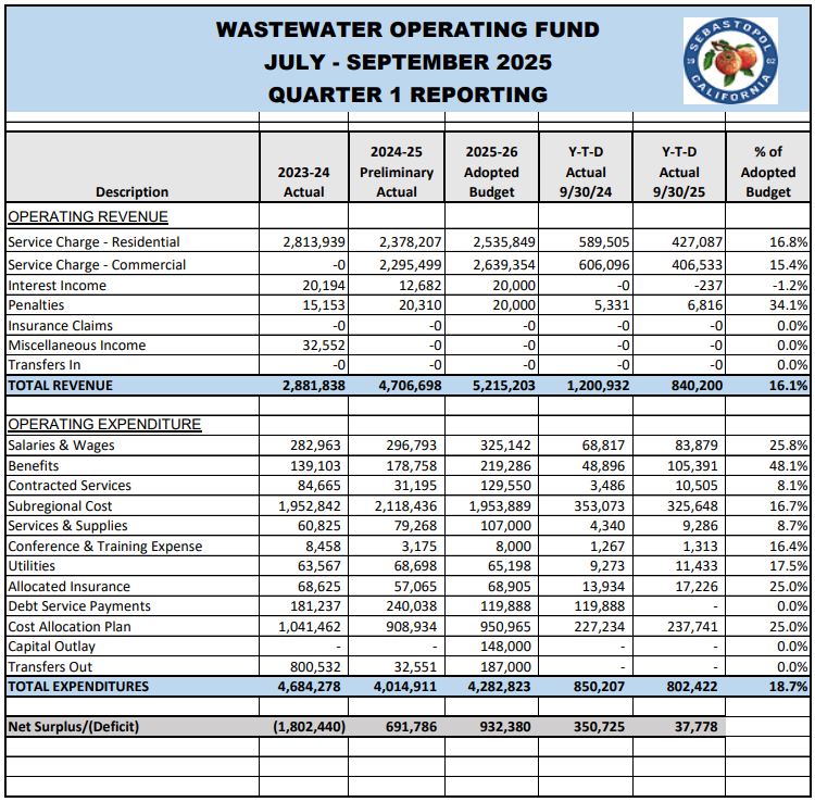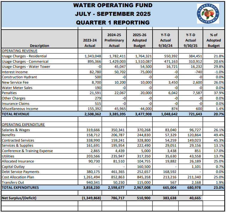 This update, which was given by Administrative Services Director Ana Kwong, covered the first quarter of the 2025-26 Enterprise Funds budgets. Kwong noted that the council’s Budget Committee had asked that she include last year’s figures for the same period so that they could easily see how the two compared.