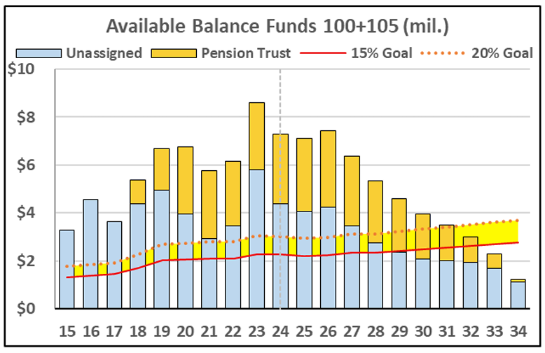 Now you’ll recall we talked a lot about budget over the last year, and what it’s come down to is this slide, showing you in blue, the unassigned balance of the general fund, and in orange, the pension trust, which we’re assuming would be gradually spent down over time in order to bolster the unassigned balance, because the pension trust would be used to reimburse general fund pension costs.