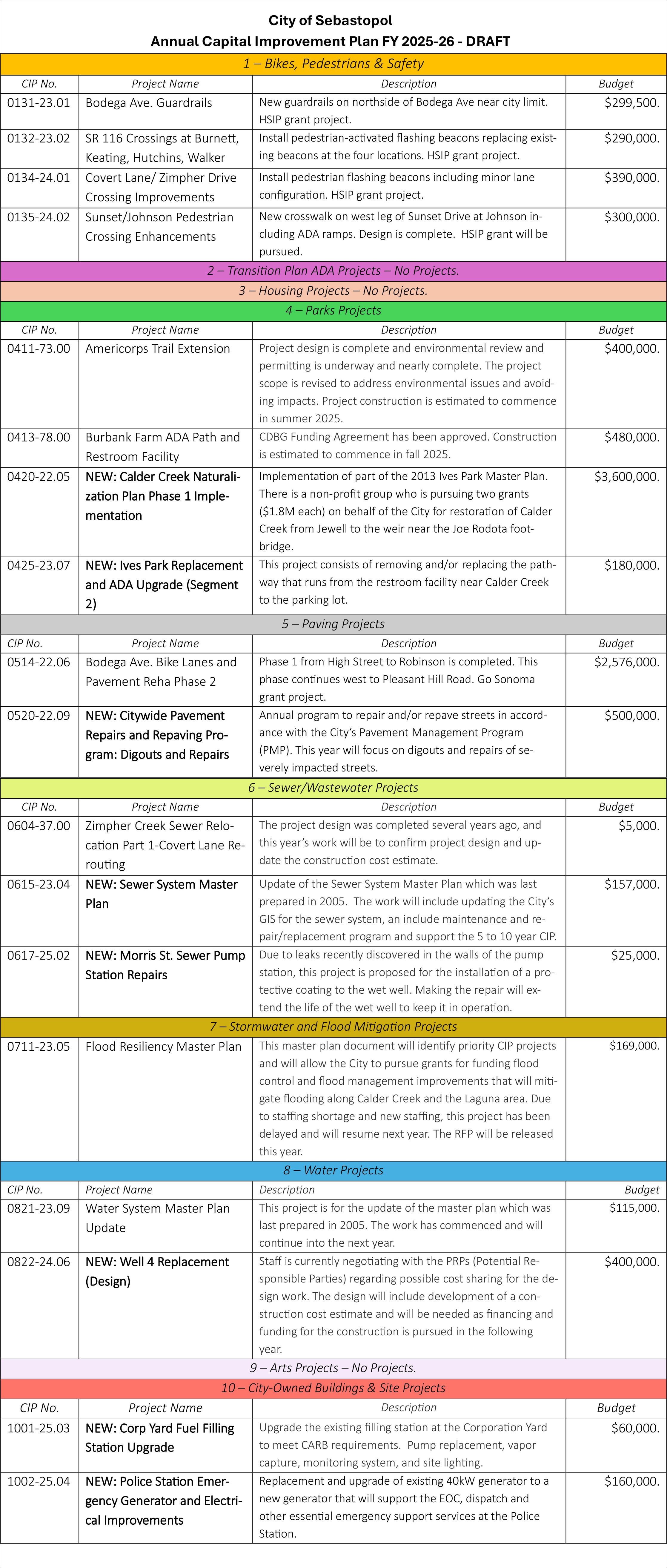 GHD Engineering consultant Toni Bertolero gave a line-by-line review of the upcoming year’s projects in the city’s CIP. The new items for 2025-2026 are bolded in the chart below. The presentation was too detailed to capture in this article. You can watch it here, starting at 2:46:33.