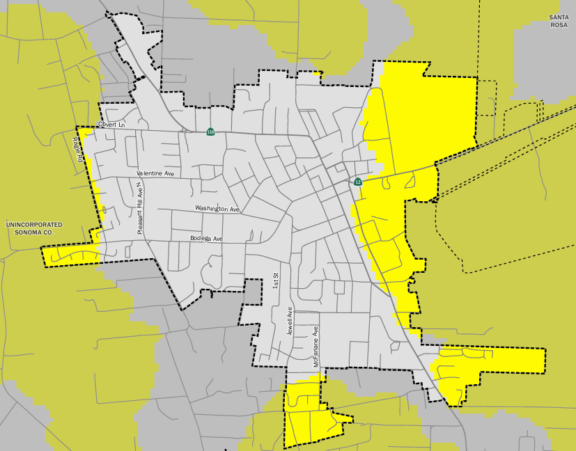 Introduction of the State Fire Marshal’s Fire Hazard Severity Zones map, which shows certain areas (322 acres) in Sebastopol falling within the moderate fire hazard severity zones. Learn more.