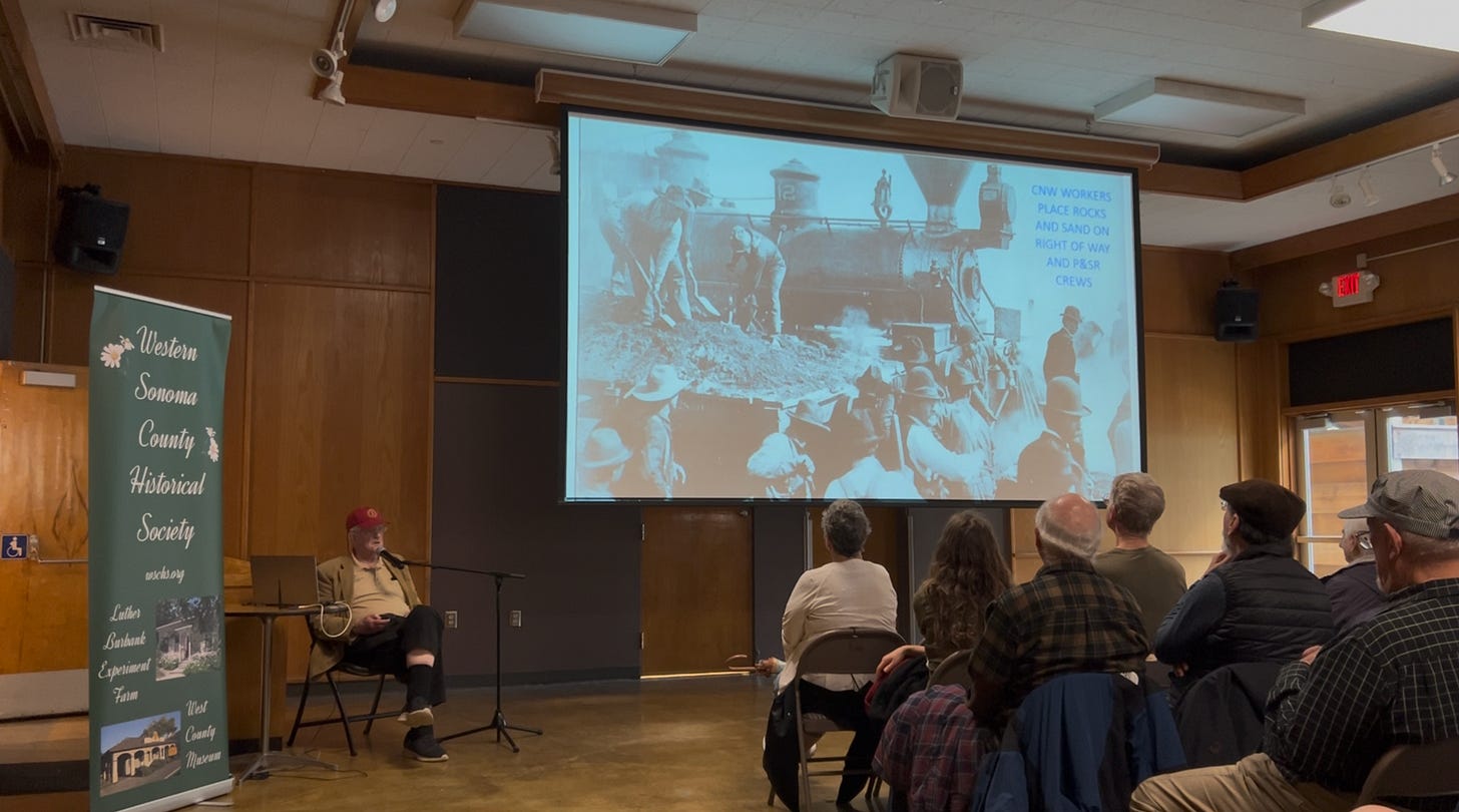 Presenting at the event was Fred Codoni, who had worked for the Petaluma and Santa Rosa Railroad (P&SR), which ran through Sebastopol, as well as other nearby railroad companies starting in the late 1950s. Codoni spent the next hour describing the colorful history of the railroad in Sebastopol, showing the audience countless images of the trains and how they changed over time.