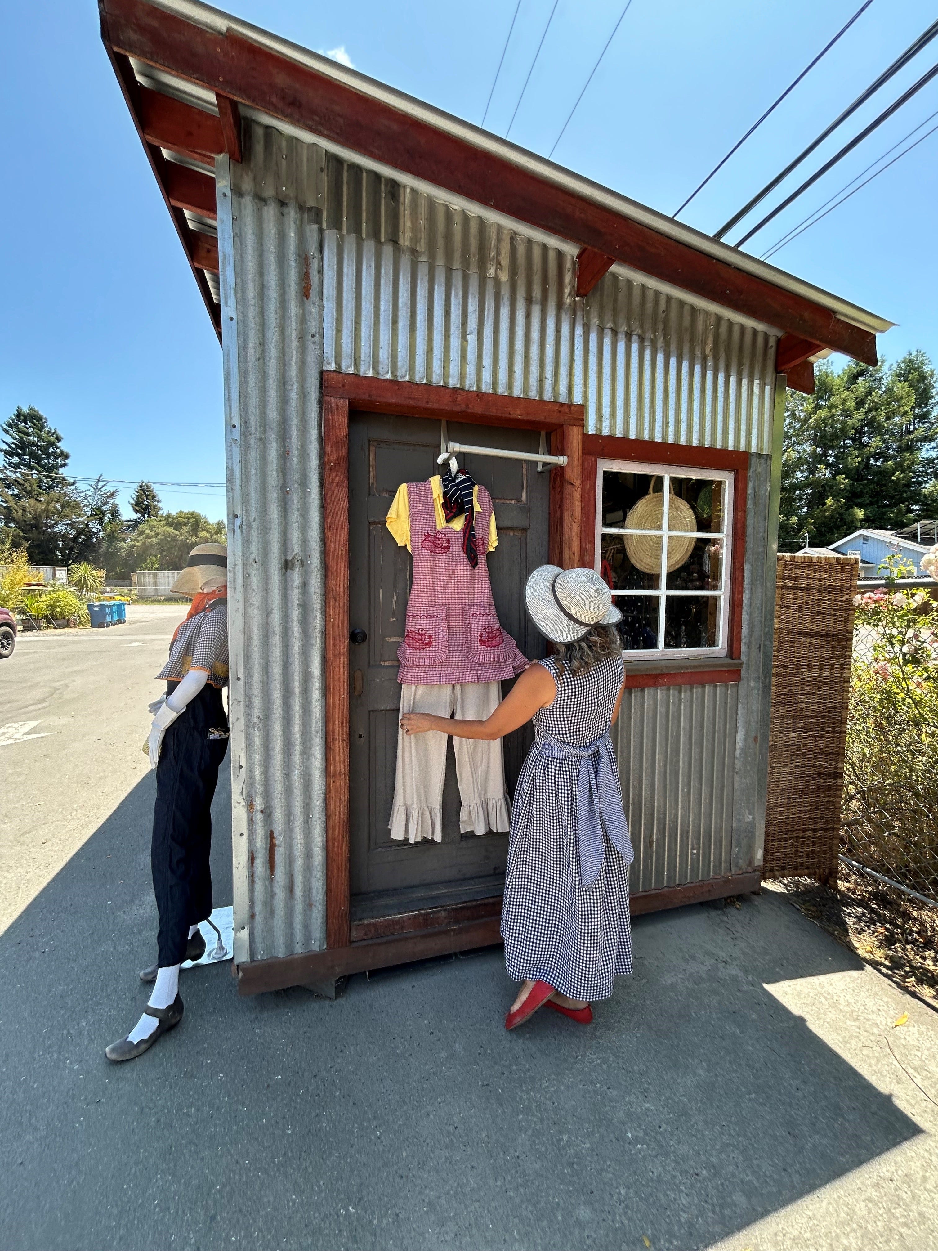The boutique reflects that philosophy. While working in the school gardens, she began layering silk slips under cotton dresses and pairing cashmere sweaters with vintage aprons. “I realized you could be practical and still feel elegant,” she said. Compliments rolled in, and during the pandemic, she launched an online store selling styled outfits—aprons, bloomers, dresses, scarves, and vintage gloves—that celebrated both style and reuse.