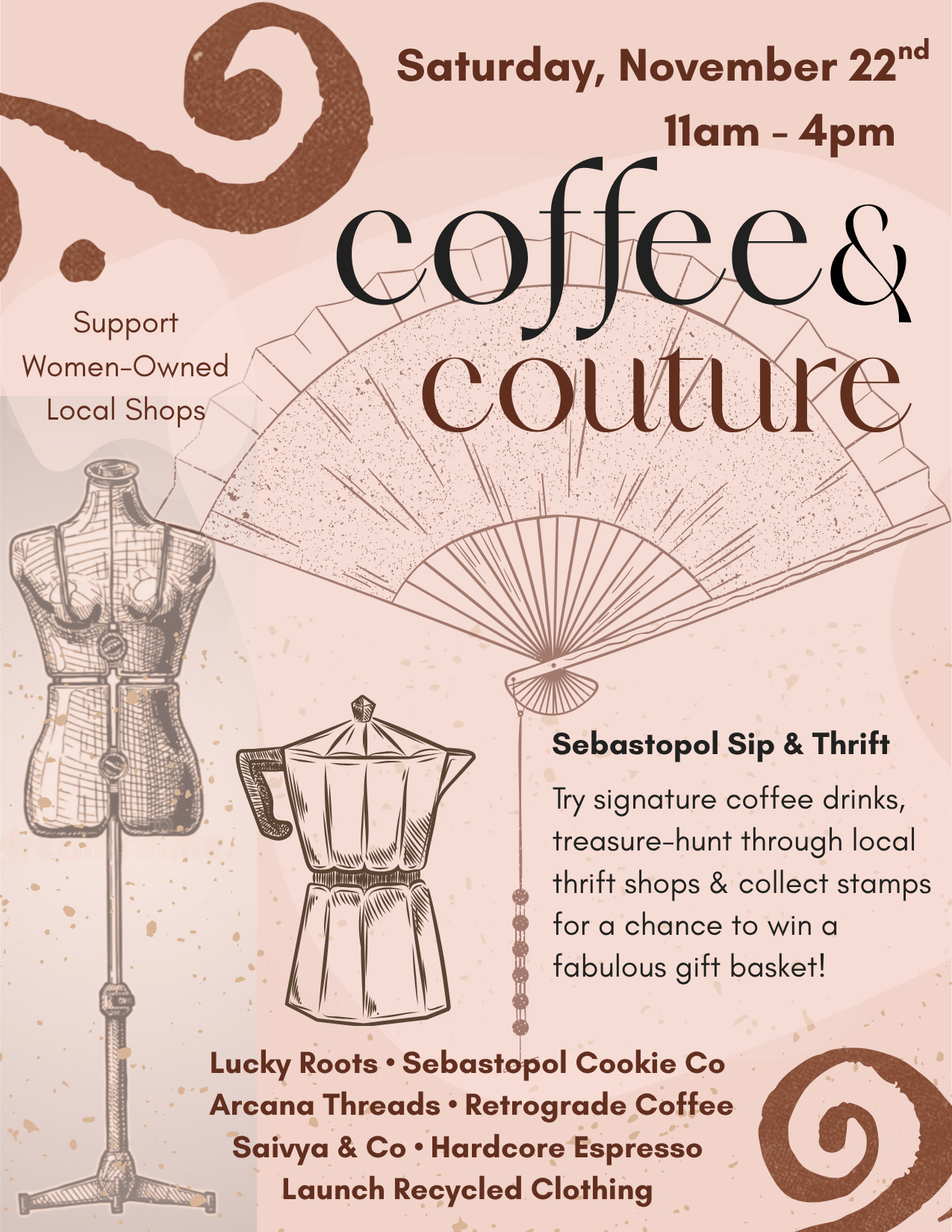 On Saturday, Nov. 22, Birnbaum will launch Coffee & Couture, a community-focused sip-and-stroll. Participants pick up a stamp card, visit participating coffee shops and thrift boutiques, and are entered to win a custom gift basket with curated items from each shop. The event spotlights sustainability, supports women-owned small businesses, and celebrates Sebastopol’s small-town feel. In true Sebastopol fashion, it’s as much about community as it is about couture