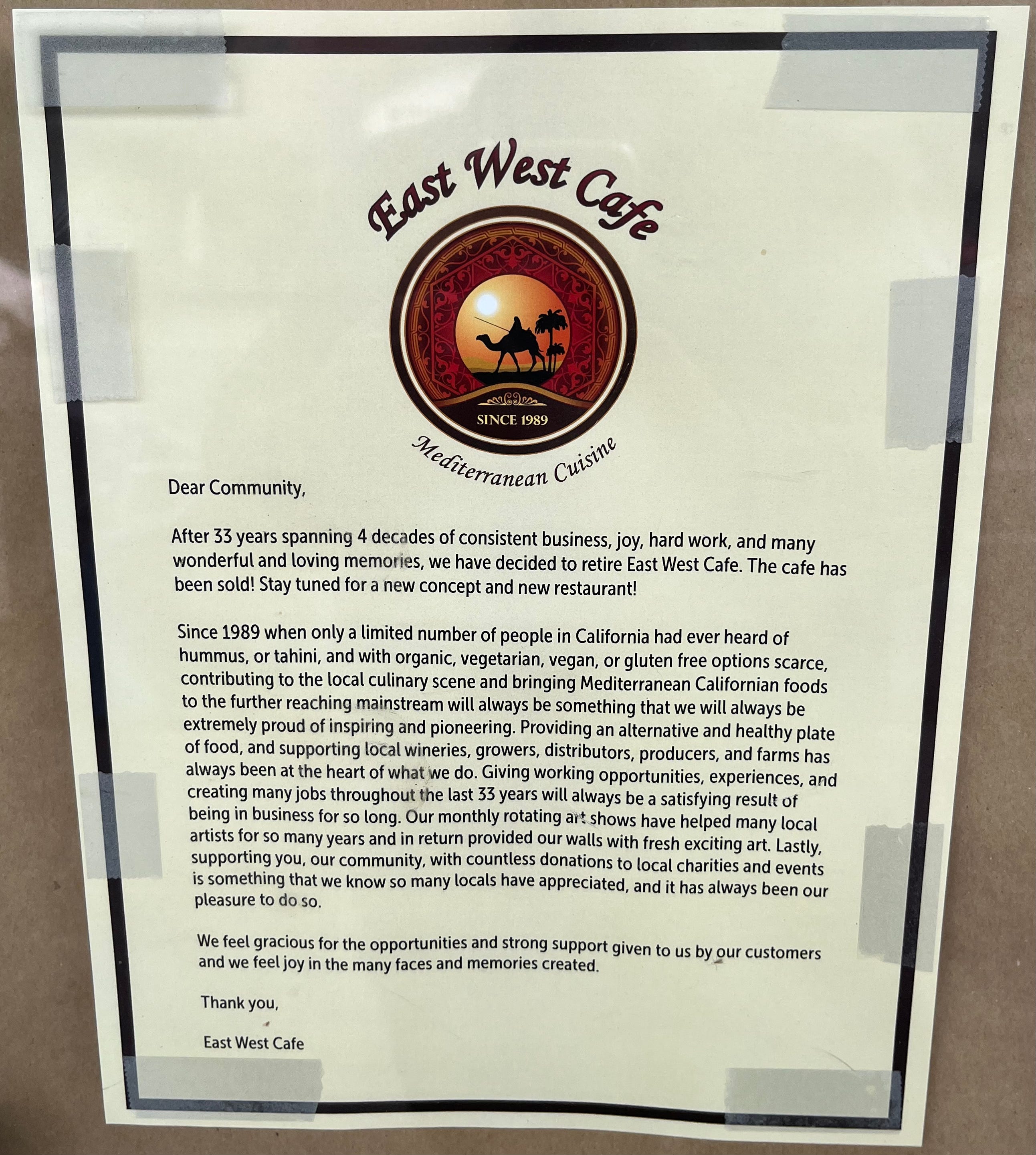 Two Sebastopol restaurants that opened over 30 years ago closed recently — the East West Cafe and Mary’s Pizza Shack. Each had a letter taped to the front door explaining over several paragraphs that they had closed and expressed gratitude for their loyal customers.